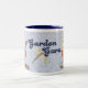 Fun Garden Guru design features a clay pot, garden tools, seed packets, dragonfly and little red ladybug. Deep blue text art says Garden Guru. Light blue floral pattern background for unique gardener gift idea.