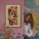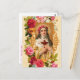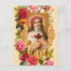 Saint Rose of Lima is surrounded by an arrangement of beautiful, colorful flowers and ornate scroll work. A background of yellow brocade compliments the elaborate illustration collage.
