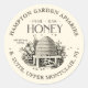 Personalize with your business name, address, and honey weight. Central illustration of a vintage skep hive in a garden surrounded by bees. Ideal for beekeepers and honey sellers. Common honey net weight conversions: 8oz (227g), 12oz (340g), 16oz (454g), 32oz (907g), 5lb (2.27kg).