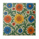 A truly enchanting piece that brings the lush beauty of a blossoming garden into your home. A vibrant, symmetrical design centered around a grand, golden-yellow flower with an intricate orange and red core. This central bloom is encircled by an abundant tapestry of swirling green vines and leaves, creating a rich, organic pattern. Scattered throughout the verdant foliage are smaller accent flowers in complementary shades of blue and red, adding depth and visual interest to the overall composition. The entire design rests upon a soft, creamy beige background, allowing the rich colors of the flowers and the intricate details of the foliage to truly pop. Inspired by classic botanical illustrations and the timeless elegance of Arts and Crafts movement designs, this tile is a testament to sophisticated artistry. Perfect as a captivating focal point in a kitchen backsplash, a charming accent in a bathroom, or as a standalone decorative piece, it will infuse any space with an air of natural beauty and artistic grace.