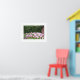 This poster is shown with dreamy pink tulips featured in this picture before a wall of brick and green ivy.