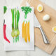 A cheerful watercolor art themed kitchen towel featuring a vibrant selection of hand painted garden vegetables on a
