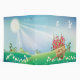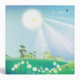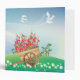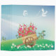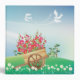 Summer days, garden wagon on the grass filled with crimson flowers and two white doves flying above in the blue sky