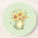 Pretty country / farmhouse design features a watercolor illustration of a garden watering can filled with a bouquet of sunflowers on mint green and white checkerboard background