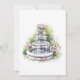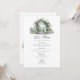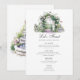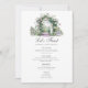 This elegant garden wedding menu design features a floral door arch and a fountain with customizable gray typography. Romantic, elegant wedding design.