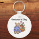 A teddy bear in blue bib overalls tends to his flowers in clay pots and text reads "Gardener at Play" on gardener T-shirts, mugs, tote bags, mousepads, stickers, buttons, and other items.