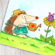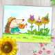 A cute little hedgehog dressed like gardener watered his sunflowers and discovered a gift, a birthday cake and a party hat for him.