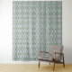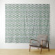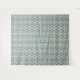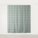 A complex geometric pattern fills the space, featuring interlocking green and white shapes that create a repeated symmetrical design. With a visually intricate layout, the pattern evokes a sense of order and structure.