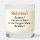 This religious scented jar candle for the Third Sunday of Advent features a simple design: the upper torso of the Blessed Virgin Mary (BVM) on the front and a short text on the back. The Third Sunday of Advent is called Gaudete Sunday. Gaudete is a Latin word meaning "Rejoice.” It is the first word of the Introit of this day's Mass. Gaudete Sunday is a significant celebration because it marks the halfway point in the Advent season and signals a shift in mood from the solemnity of the season’s first two weeks that focused on repentance and watchfulness to the season’s last two weeks that focus on the joyful anticipation of the Savior’s birth at Christmas. Pink (or light rose) is its liturgical color, appearing in priestly vestments and in the third of the four candles of Advent wreaths. + Here, the Blessed Virgin Mary, obviously pregnant and in her third trimester, is depicted wearing a deep pink robe cinched above her belly with a gold ribbon and a royal blue hooded mantle lined in emerald green. The original painting from which this image is derived is entitled Our Lady of Graces by Pietro Perugino (1448-1523), an Italian Renaissance painter of the Umbrian school, and is located in the Cathedral of San Lorenzo [St. Lawrence], in Perugia, Italy. + Front Image Credit (Madonna): Extracted from an undivided back Italian postcard (1901-1907), “Ricordo del Cinquantesimo dell’incoronazione di Maria SS. Delle Grazie che si venera nella Cattedrale di Perugia: Settembre 1855-1905,” that is, “Commemoration of the fiftieth anniversary of the crowning of Holy Mary of the Graces which is venerated in the Cathedral of Perugia: September 1855-1905,” published in chromolithography by P. Casetti & Co., Rome, from the designer’s private collection of religious ephemera. In 1855, the original painting was encased in a protective wooden tabernacle in the NeoGothic style where it remains today on the third pillar of the nave to the right from the Cathedral’s entrance. + The text on the back is a translation from the Latin of the refrain of a 16th-century sacred Christmas carol.