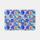 A colorful mosaic seamless pattern inspired in the artwork of Catalan architect Antoni Gaudi, featuring multicolored round blue, red and yellow tile pieces in different shades over a tiled light acqua blue background. A perfect gift for Catalan Modernism and Barcelona lovers.