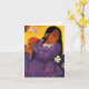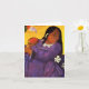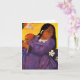 Paul Gauguin Woman with a Mango note card. Oil painting on canvas from 1892. Gauguin is renowned for his famous paintings of Tahiti and its people. Woman with a Mango is one of his most expressive works. The painting features a girl with dark black hair in a purple dress smiling slightly while holding a red mango in her right hand before a yellow wall. A small caption reads “Vahine no te Vi.” A great gift for fans of Gauguin, Cloisonnism, Tahiti, and tropical painting.