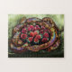 Surreal art puzzle, a rainbow boa constrictor snake gaurds a bunch of strawberries