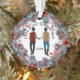 Celebrate your first Christmas together with this beautiful illustration of two brunette haired men, one is caucasian and the other African American, wearing casual denims and winter clothing. They have their backs towards your and are walking holding hands. They are framed by a wooden twig frame that has delicate red berries, cotton balls, pine cones and fir leaves on it and the words, our first Christmas followed by the year. The back has a template for your custom photo.