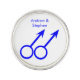 This awesome lapel pin is designed for gay men. It features two blue male symbols standing side by side. The background is white and there is customizable blue text above the symbols to put names.