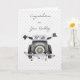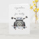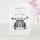 A wedding congratulations card for a gay male wedding. Design features car with cans and two men with their arms out the windows holding top hats. Background of white hearts on light gray. (created with original artwork©delightful-doodles)