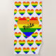 This roomy beach towel has a repeating pattern of Rainbow Flag Hearts. In the center is a large Rainbow Flag Heart, with the word "Pride" in a large scripted font.