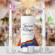 This beautiful unity candle set is designed as a part of our Gay Pride Rainbow Wedding Suite. It features the names of the couple as well as the wedding date and a row of gay pride rainbow flags. Each taper candle has the first initial of each of the wedding couple. Beautiful part of any wedding ceremony.