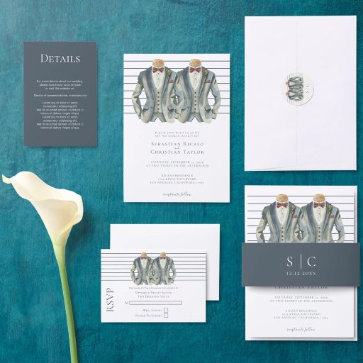 Gay Wedding Two Grooms in Suits and Bow Ties RSVP