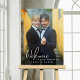Personalize this photo wedding welcome sign with your portrait or photo. Modern handwritten script spells out "Welcome" and includes a template for adding the names of the couple getting married. Be sure to use a vertical photo that is high enough resolution that can be enlarged to fit the size of your foam core poster. Shown here in the 18-inch by 24-inch size, other sizes are available as well.