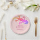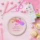 Gecko birthday paper plates for kids. The plates have a cute gecko. Rainbow gecko is especially great for girls. The background is pink. Personalizable paper plates with a Happy Birthday text and a child`s name. Easily personalize the plates. The text is in pink color. Great for a boy or girl birthday party.