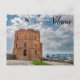Painting of Gediminas tower monument in Vilnius, Lithuania. Small orange brick tower with Lithuanian flag on the hill against beautiful view on historic city center in Vilnius.