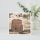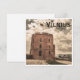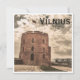 Vintage postcard of Vilnius. Gediminas tower monument in Vilnius, Lithuania. Small orange brick tower with Lithuanian flag on the hill against beautiful view on historic city center in Vilnius.