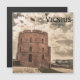 Vintage postcard of Vilnius. Gediminas tower monument in Vilnius, Lithuania. Small orange brick tower with Lithuanian flag on the hill against beautiful view on historic city center in Vilnius.