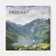 Square souvenir photo magnet of the famous fjord Geirangerfjord, a cruise ship and the village of Geiranger between the mountains in Norway with the text: 'NORWAY, Geirangerfjord'.