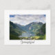 Postcard of the famous fjord Geirangerfjord, a cruise ship and the village of Geiranger between the mountains in Norway with a white border and the text: 'Geirangerfjord'.