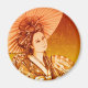 Imán redondo con dibujo de Geisha para colocar sobre superficies metálicas. Adorno para cocinas o paneles de escritorios