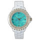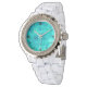 Women's watch in a gem stone slab pattern of blue Larimar or blue pectolite, also called the "Atlantis stone", in a silky pattern of soft sky blue and aqua