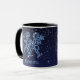 Mug featuring the zodiac symbol for Gemini in soft silver blue, overlaid with the stars of the constellation, against a starry sky background graded from deep midnight blue to black