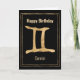 Send a personalized Happy Birthday greeting card to your favorite Gemini with this stylized hammered gold Gemini the Twins astrology zodiac star sign in a gold double line frame on a black background. The Happy Birthday and Zodiac sign text on the front of the card can be personalized if you have another greeting in mind. Inside the card you can add the name of the Birthday girl or boy above the text that says: You are going to have a terrific birthday, it's written in the stars. A fun personalized card for someone born under the star sign of Gemini.