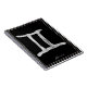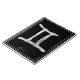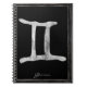 Stylized hammered silver Gemini the Twins astrology zodiac birthday symbol in a hand drawn silver fine double line frame. This notebook or dream journal or writing pad has Gemini text in a fine script, which can be personalized to narrate your own story.