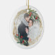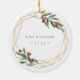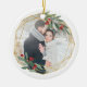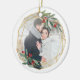 Elegant photo Christmas ornament features a favorite photo encircled by a faux gold foil geometric frame with green watercolor foliage and red berries. Add your names and the year, or a custom message, to the reverse side in a matching frame.