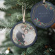 Elegant photo Christmas ornament features a favorite photo encircled by a faux gold foil geometric frame with green watercolor foliage and red berries. Add your names and the year, or a custom message, to the reverse side in a matching frame.