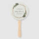 Boho gender neutral baby shower hand fans with your name, event title and date inside of a modern gold geometric frame surrounded by greenery and white flowers. The backside has your personalized message inside the same geometric frame. An elegant botanical design that is perfect for a bohemian celebration in the summer.