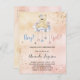 For a gender reveal baby shower. A rustic golden and blush pink background. A teddy bear with white, blue and pink balloons and golden glitter dust. Personalize and add the name of the mom to-be and party details. The name and the text: Boy? Girl? are written with a hand lettered style script