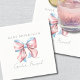 A charming cocktail napkin design featuring a large pink and blue watercolor bow in the center. At the top, "Baby Last Name" is displayed in a classic serif font, with "Gender Reveal" elegantly written below in handwritten script.