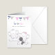 Adorable modern design featuring two baby elephants with a gray/pink and navy blue flag banner at top where "he or she what will our peanut be?" is titled. On reverse side are our invitation templates, greenery and pink and navy blue rainbow with pink heart. Girl elephant holding a black dog.