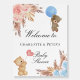 A welcome board for an elegant and modern baby shower, gender reveal party. A white background, boho style pampas grass, pink and light blue florals and a teddy bear boy and girl holding blue and pink balloons. Personalize and add the names
