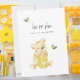 Adorable design featuring a cute teddy bear with a barrel of honey watching a cute honey bee buzz around while another flies around at top where "he or she what will our baby bee?" is titled. On reverse side are our invitation templates, greenery and yellow flowers. *NOTE: Check collection or store for digital download option!