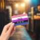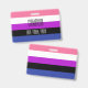The background is the pride flag for genderfluid people. This is a striped pattern of pink, white, purple, black and blue. There is space for a custom name and pronouns.
