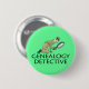 Cartoon of a detective in a raincoat with a large magnifying glass and caption Genealogy Detective in large black text.
