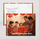 Customizable on front and back Chinese New Year postcard with a heartwarming illustration portraying three Chinese children, their father, and grandfather, all wearing radiant smiles as they celebrate the Chinese New Year together. Seated in a room adorned with red lanterns, symbolizing good luck, the family gathers around a red book, reading tales that pass down traditions and wisdom from one generation to the next.