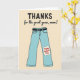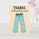 This card features a pair of stylized trousers in soft aqua blue, outlined in black, centered against a creamy beige background. A black belt with a small buckle wraps the waist, giving the simple design a grounded, everyday charm. Above the pants, the word “THANKS” sits in large black letters, and just beneath it the phrase “for the great genes, mom!” appears in a looser, handwritten look, also in black. The joke lands visually like a friendly wink, turning the outfit into a sweet nod of affection ❤️. Near the lower right leg, a pale patch looks slightly uneven at the edges, like a small repair made with care. On that patch, “Happy Mother’s Day” is written in bright red lettering that curves gently across the fabric 🌼. The trousers remain the main focus, with the red message patch standing out clearly on the right leg.
