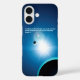 A stylized image in blue tones and white of the Earth and Moon backlit by the sun. An English translation of Genesis 1:4 reading "God saw that the light was good, and God divided the light from the darkness" also appears in glowing blue and white.