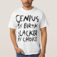 Genius by Birth, Slacker by Choice Light Tee Shirt: For the smart but lazy. Funny parody spoof satire joke jokes comedy brilliant brain brains brainy deadbeat stupid dumb idiot wasted irony ironic quirky goofy silly hilarious ridiculous weird odd strange offbeat odd awesome pop culture humor.