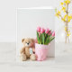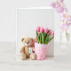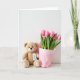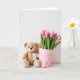 The front design shows a calm still-life scene on a plain white background, where a light brown plush figure sits low in the layout with a small stitched smile and dark, friendly eyes that seem to gaze toward the flowers with gentle fondness ❤️. A tiny white tag hangs at its neck on a bright red string, adding a sweet “gift-ready” touch without needing extra decoration. On the tag, a small green drawing of a young sprout sits near the center, like a quiet nod to growing affection. Right beside the plush figure, a bouquet of pink tulips stands tall, their buds mostly closed as if saving their bloom for someone special. The tulips are a uniform rosy pink, contrasted by slim green stems and leaves that rise neatly upward. They’re wrapped in soft pink paper with light creases, and a white patterned band runs near the top edge, framing the bouquet like a gentle embrace 🌼. The message text sits at the top in red, centered above the flowers and the plush figure.