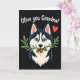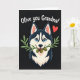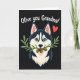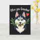 This card features a cheerful, stylized dog centered on a deep black background, drawn with contrasting light and dark fur like a snowy-region breed. The dog faces forward with luminous blue eyes and a gentle smile that feels like a warm, friendly glance meant just for someone special ❤️. Held carefully in its mouth is a leafy green sprig with several small green fruits, adding a sweet, affectionate touch as if it’s offering a little gift. Across the top, white lettering spells out “Olive you Grandma!” with the words stretched neatly from left to right. A bright red heart sits near the upper right corner, balancing the layout and adding an extra note of closeness. The strong contrast makes the fur texture and the soft green leaves stand out clearly, while the simple background keeps all attention on the dog’s tender expression. The dog’s pointed ears frame its face, and the sprig angles slightly upward with clustered green fruit and tiny leaves 🌼.